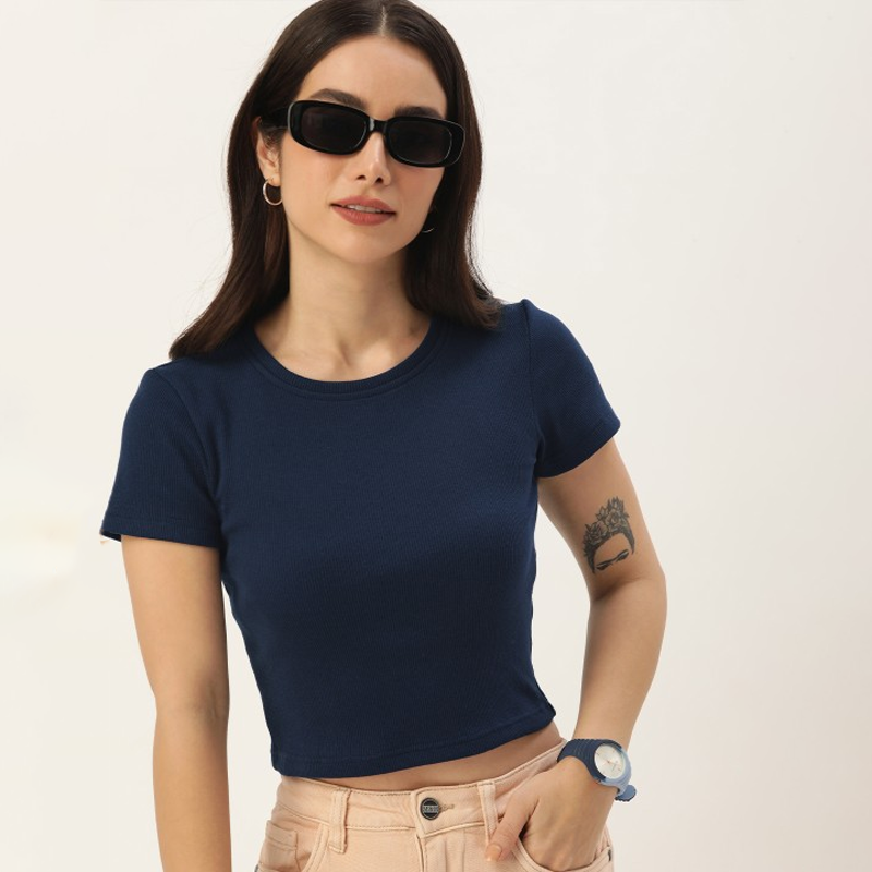 Solid Round Neck Ribbed Crop T-shirt