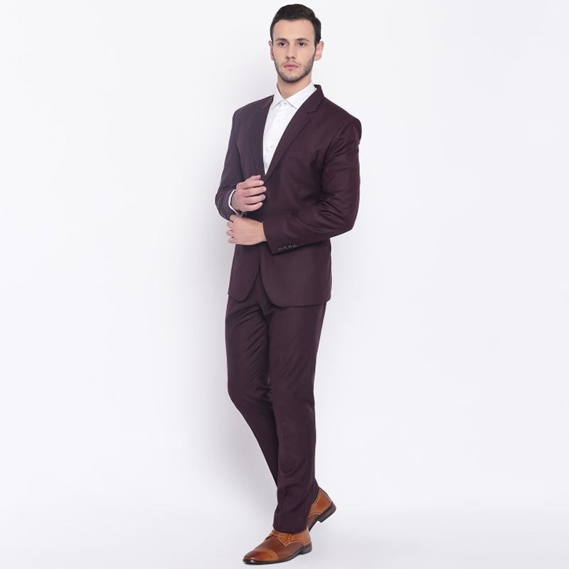 Men Burgundy Solid Single-Breasted Slim-Fit Formal Suit